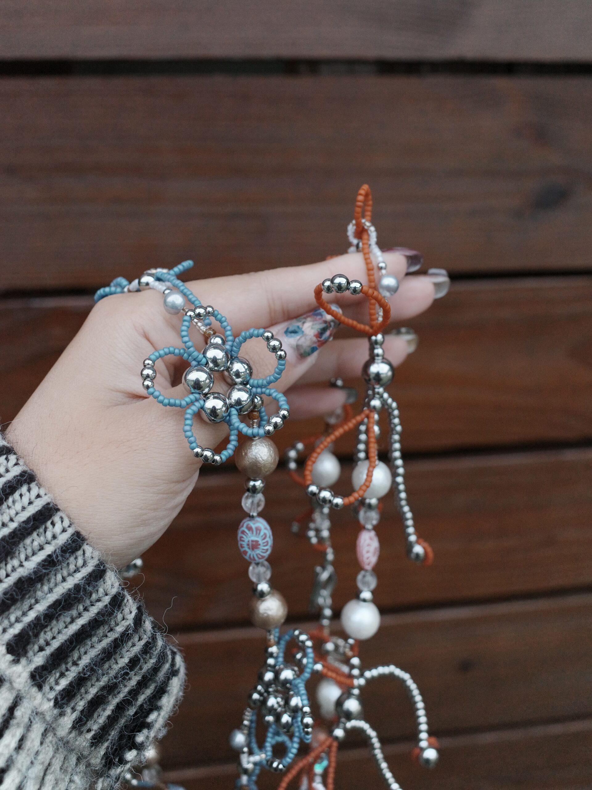 Material | 鈦鋼五金、鈦鋼珠、橙雪花幽靈、藍紋瑪瑙、白水晶、天然淡水珍珠、日本珠、捷克珠、貝珍珠