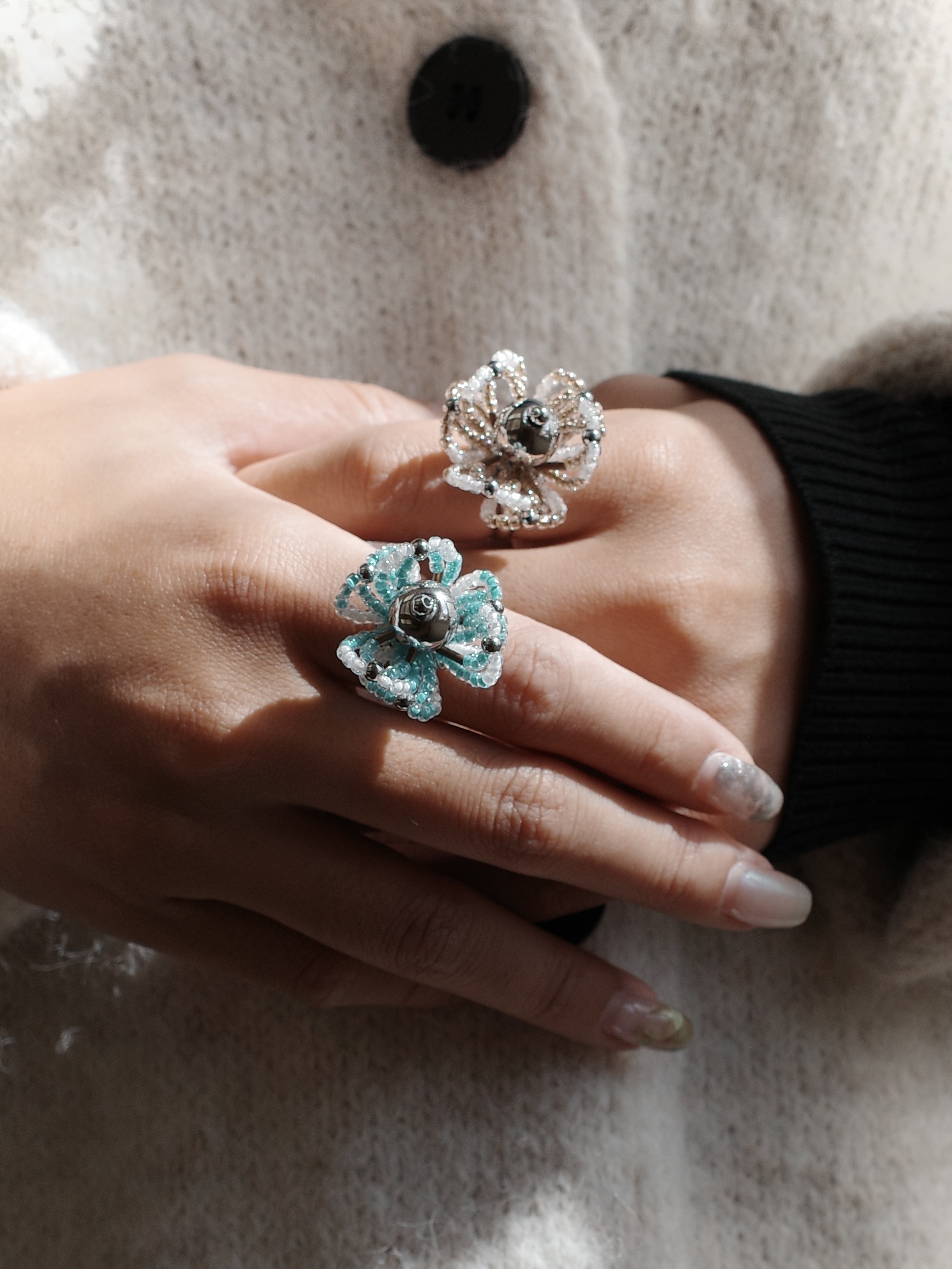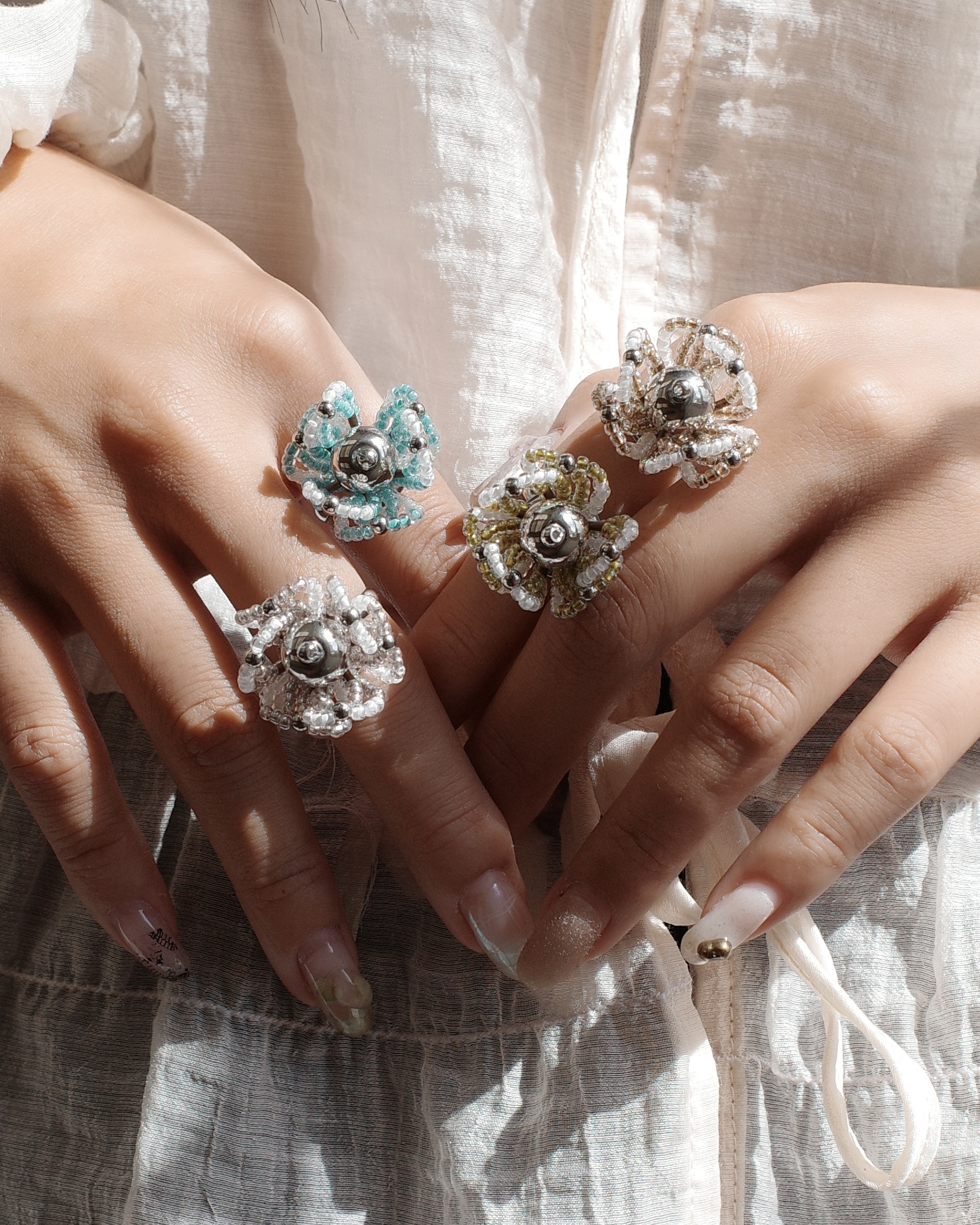 Material | 不鏽鋼可調節戒圍、日本珠、鈦鋼珠 Color | 銀白、茶綠、褐金、藍綠