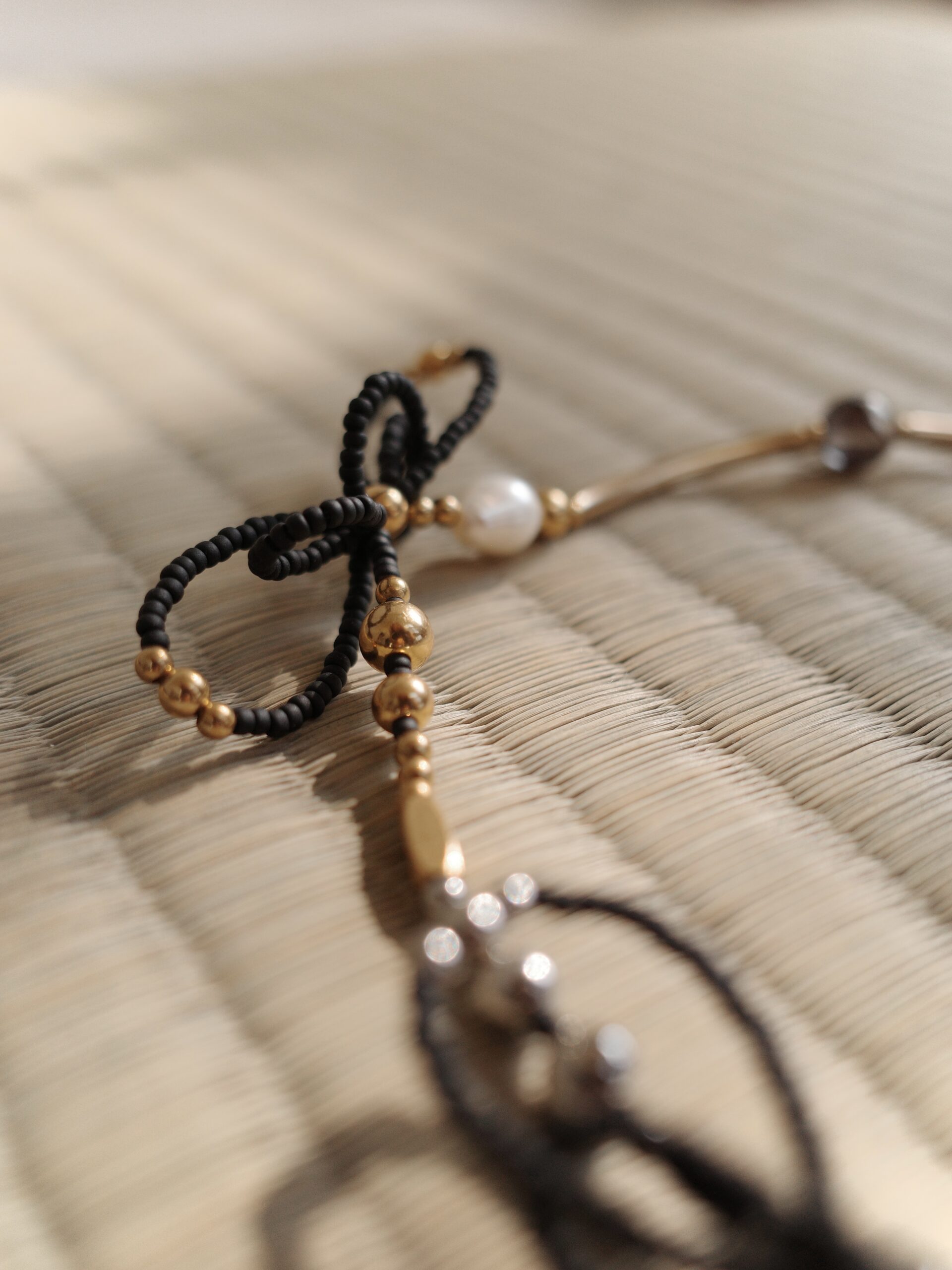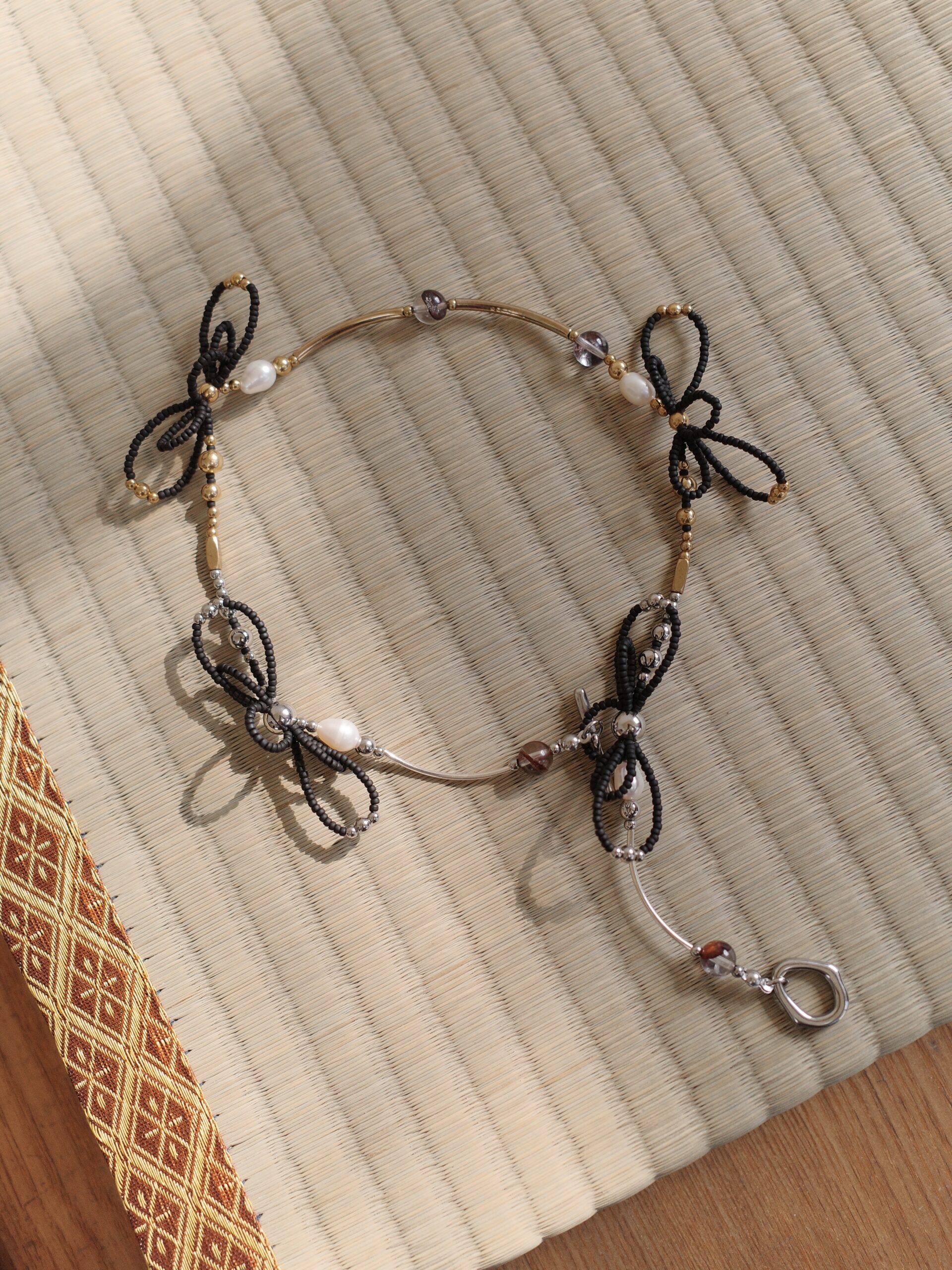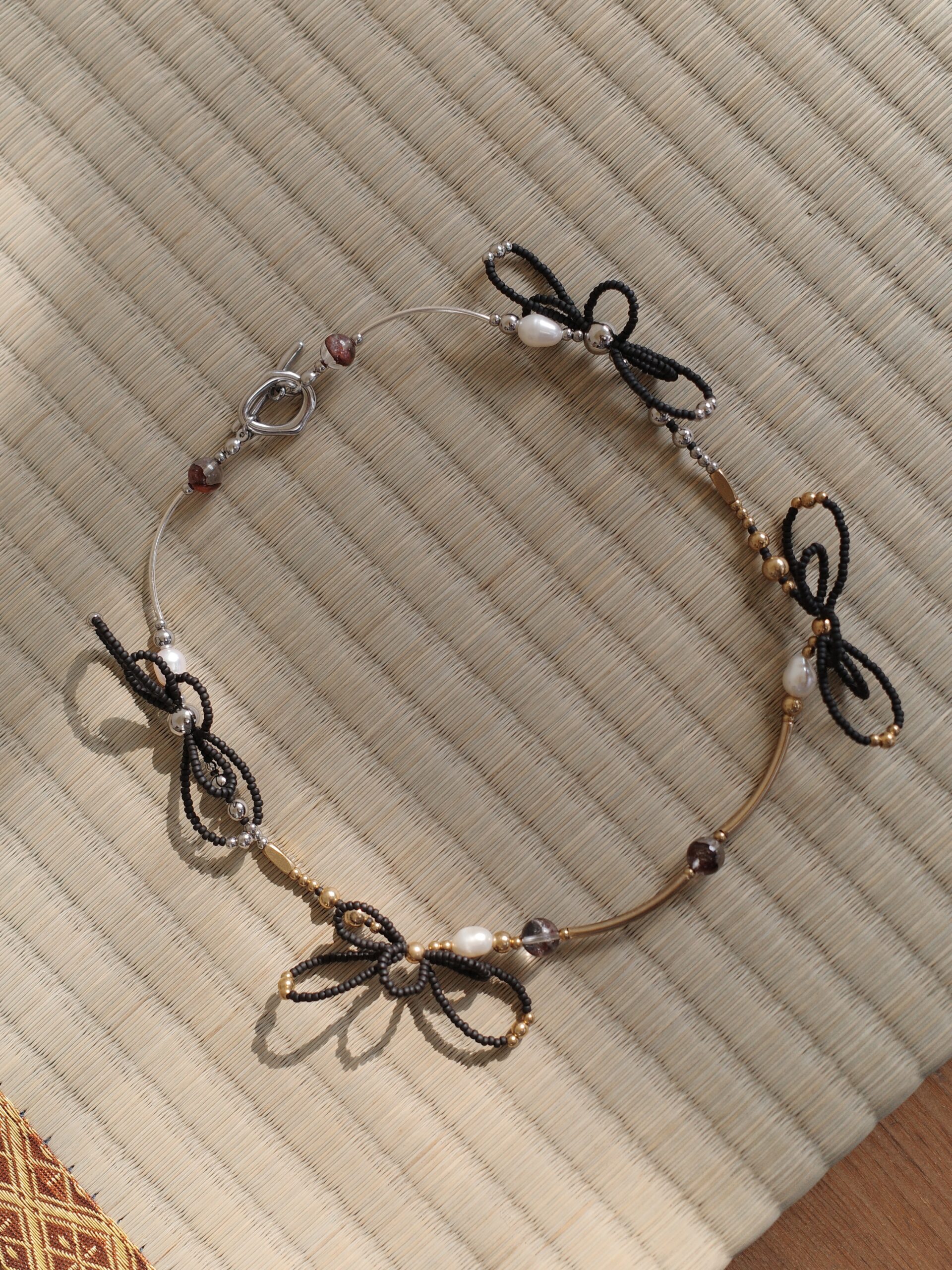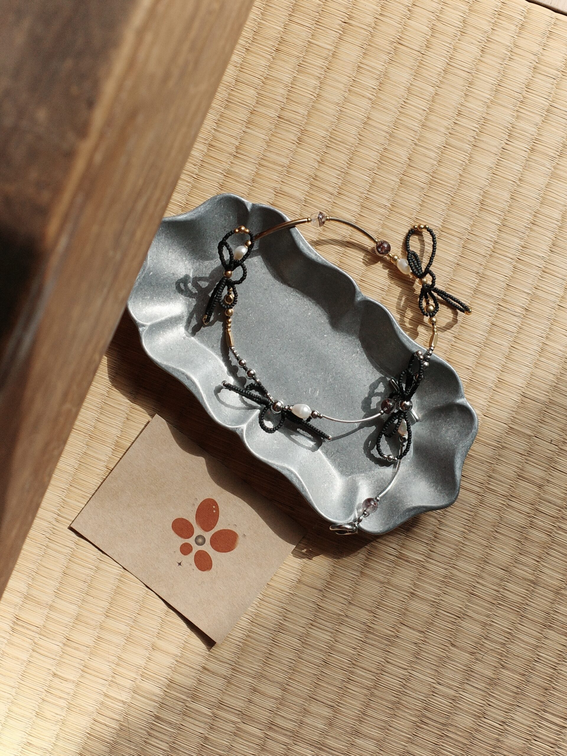 Material | 鈦鋼五金、紅膠花、純銀彎管、鈦鋼珠、黃銅彎管、黃銅珠、天然淡水珍珠、日本珠